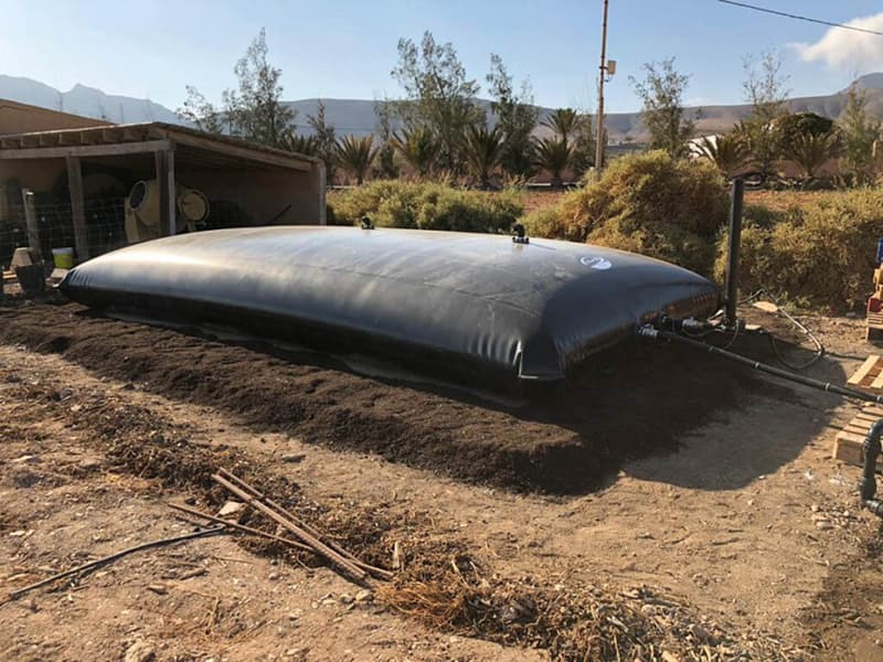 Han instalado un deposito de 20.000 litros, porque como dice Valentino, y casi todos nuestros clientes de las Islas Canarias, «el agua aquí es escasa y cara». Pasan a diario 20.000 litros del contador al depósito flexible Flexitanq. Tienen conectado otro deposito con abonos orgánicos, y con una bomba monofásica, sacan agua y los nutrientes necesarios que quieren suministrar. También tienen conectado al deposito una Sonda de Nivel, que le enviamos con el deposito, para ordenar de forma automática el llenado , y así asegurar la continuidad del riego en el invernadero.