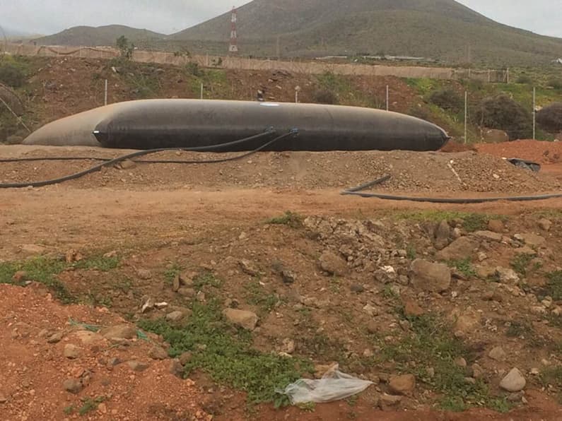 Es fácil adivinar la zona por la tierra rojiza propia de la Isla y de las tierras con componentes volcánicos. Con esto pueden atender a su negocio, a la parcela de 4.000 m2 y a su vivienda Familiar. Cada semana, reponen los 100.000 litros del deposito de agua flexible. Este dato es curioso para que tengamos datos más reales del consumo de agua que hacemos. Es tan vital el agua, para su día a día, que no pueden dejar este suministro a expensas de la suerte.
