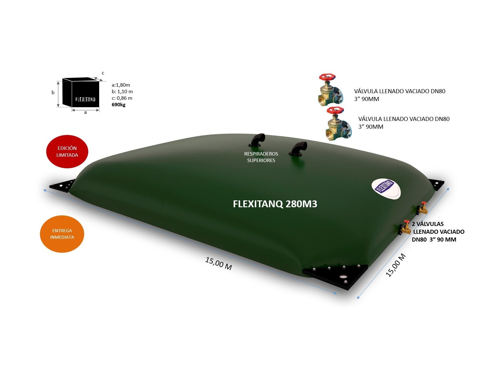 Flexitanq para contención de líquidos. Depósito recomendado para almacenar agua de riego, agua sanitaria, agua de lluvia, agua de piscinas. Para el almacenamiento de otros líquidos, por favor contacte con info@flexitanq.es