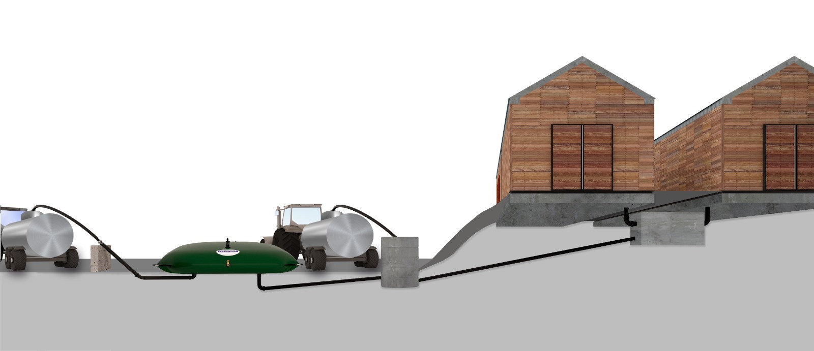 En este sistema el purín se lleva a la arqueta directamente, y desde ahí se puede sacar con la cuba, o si preferimos, se instala una segunda brida de fondo, y la salida del purín se hace directamente por otro extremo con la cuba.